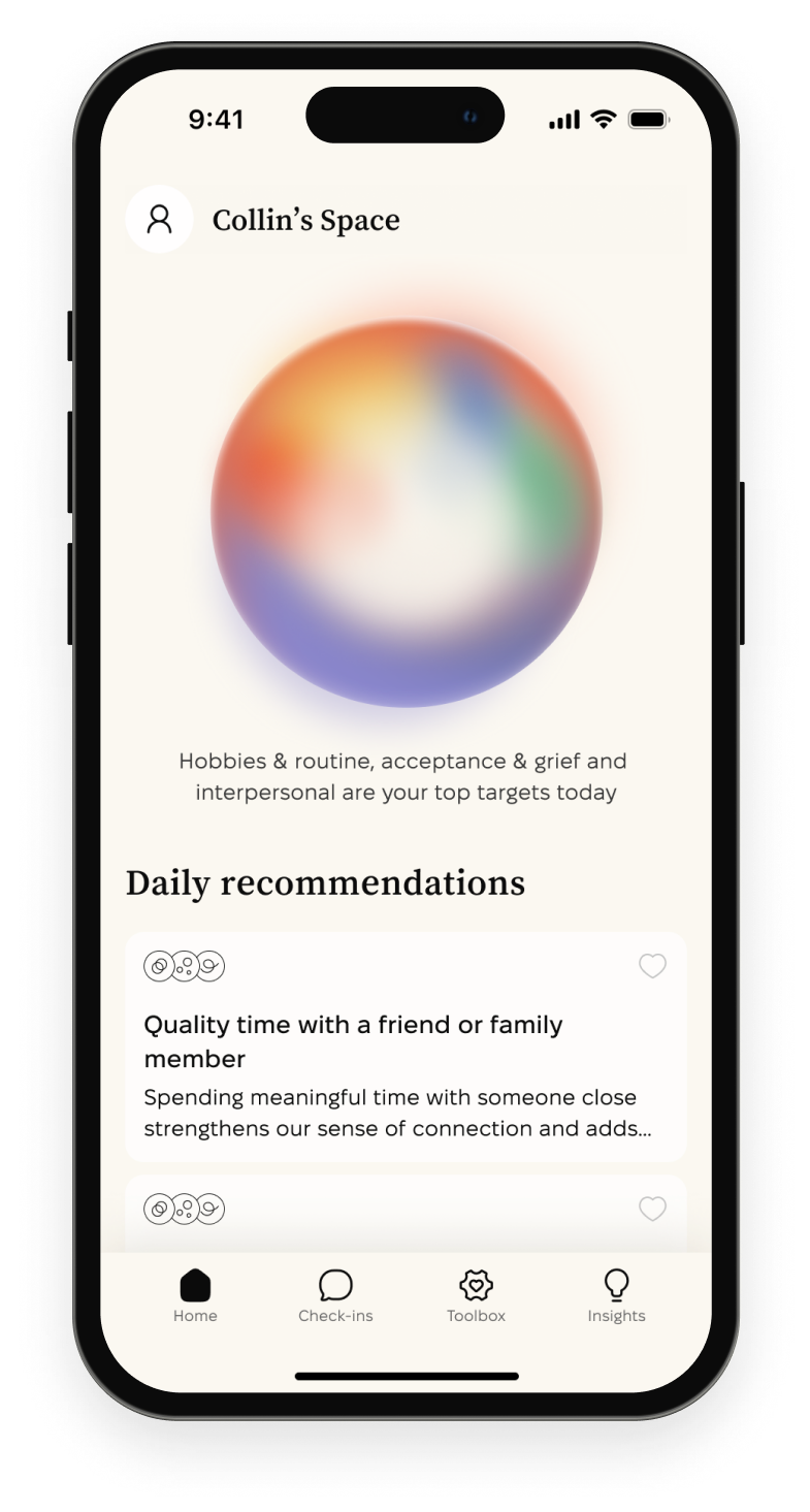 Built by therapists and enhanced by AI, Inner Space helps you create healthy habits for a lasting sense of balance. They’re simple to build into your day and lead to meaningful change.